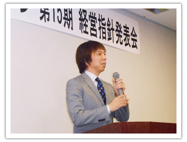 わが社では月に一度、社員全員で丸一日掛けて経営指針を策定するための会議を行っています。そして毎年2月、取引先や金融機関の方々をお招きして、経営指針発表会を開催しています。社員一人ひとりが発表を通じて、自分自身の一年間の成長を実感できる場となっています。